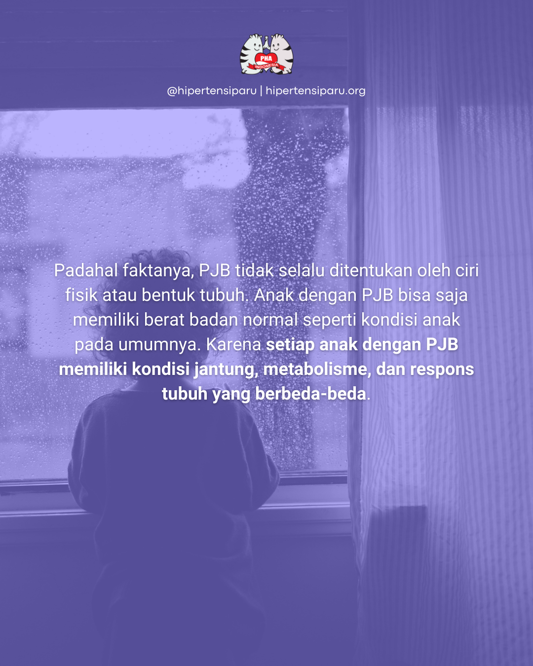 Setiap anak dengan PJB memiliki kondisi jantung, metabolisme, dan respons tubuh yang berbeda-beda. Ada yang tampak kurus, ada pula yang terlihat berisi. Ada yang mudah lelah, namun ada juga yang mampu beraktivitas seperti anak-anak lain seusianya. Inilah mengapa PJB tidak memiliki satu bentuk tubuh tertentu.