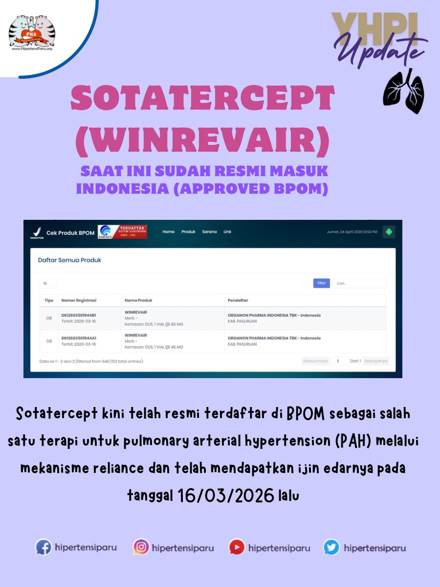 Sotatercept kini telah resmi terdaftar di BPOM sebagai salah satu terapi untuk pulmonary arterial hypertension (PAH) melalui mekanisme reliance dan telah mendapatkan ijin edarnya pada tanggal 16/03/2026 lalu.